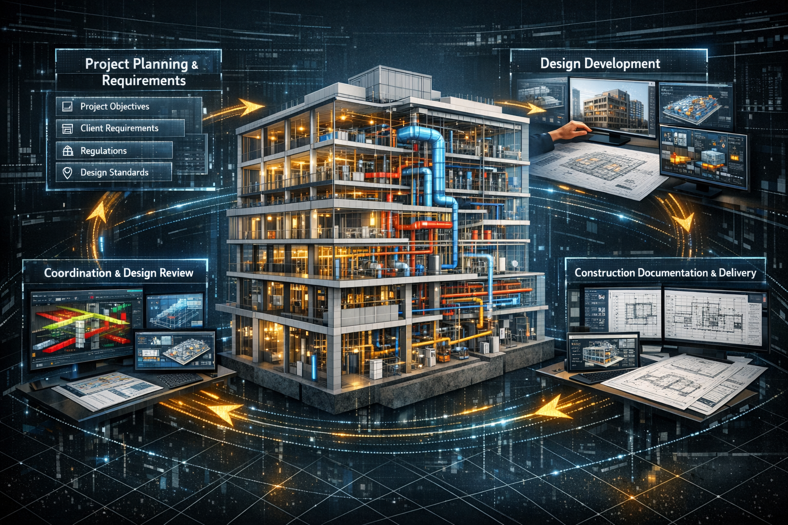 Following the planning stage, our team develops architectural concepts and integrated engineering solutions. Architects and engineers collaborate closely to create coordinated designs addressing spatial planning, structural stability, mechanical systems, electrical distribution, plumbing networks, and fire protection requirements. Each discipline contributes specialized expertise while maintaining alignment with project standards, sustainability goals, and functional performance. This phase focuses on producing technically sound and well-integrated design solutions that support efficiency and constructability.