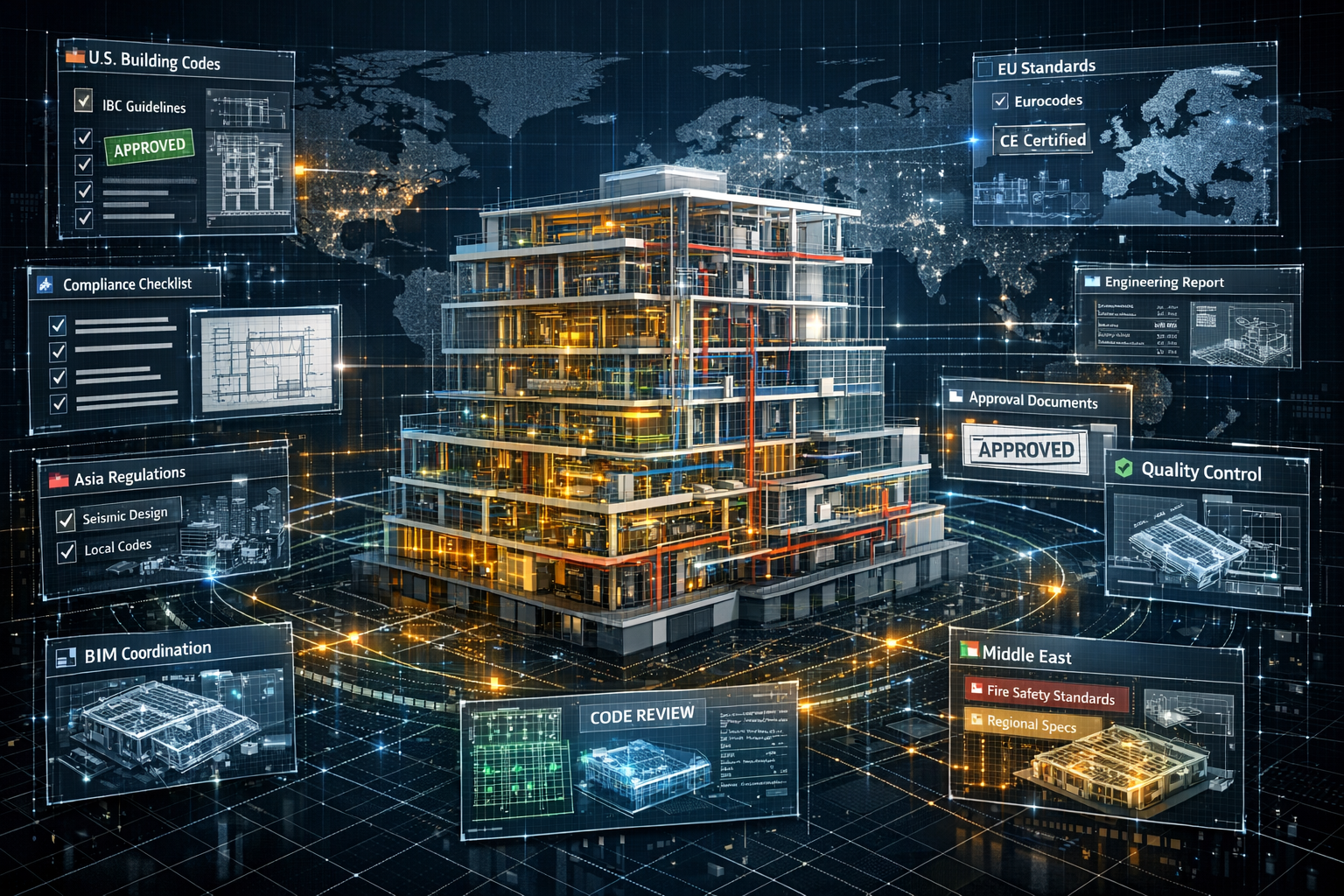 Our team works closely with architects, engineers, consultants, and contractors to ensure full compliance with local building codes, engineering standards, and regulatory guidelines. Throughout the design and coordination process, we align BIM models, engineering analysis, and technical documentation with regional requirements and project-specific regulations. This collaborative approach helps minimize compliance risks, streamline approval procedures, and ensure that project documentation meets the expectations of both local authorities and global project teams.